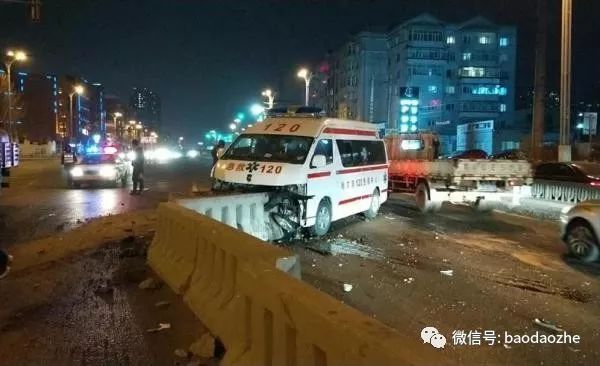 事故发生后,一辆120急救车火速前往事发现场救人。不幸的是,在途中,这辆救护车也发生了车祸,撞在路中间的水泥墩上,救护车的驾驶员被困,车上两名医护人员受伤。